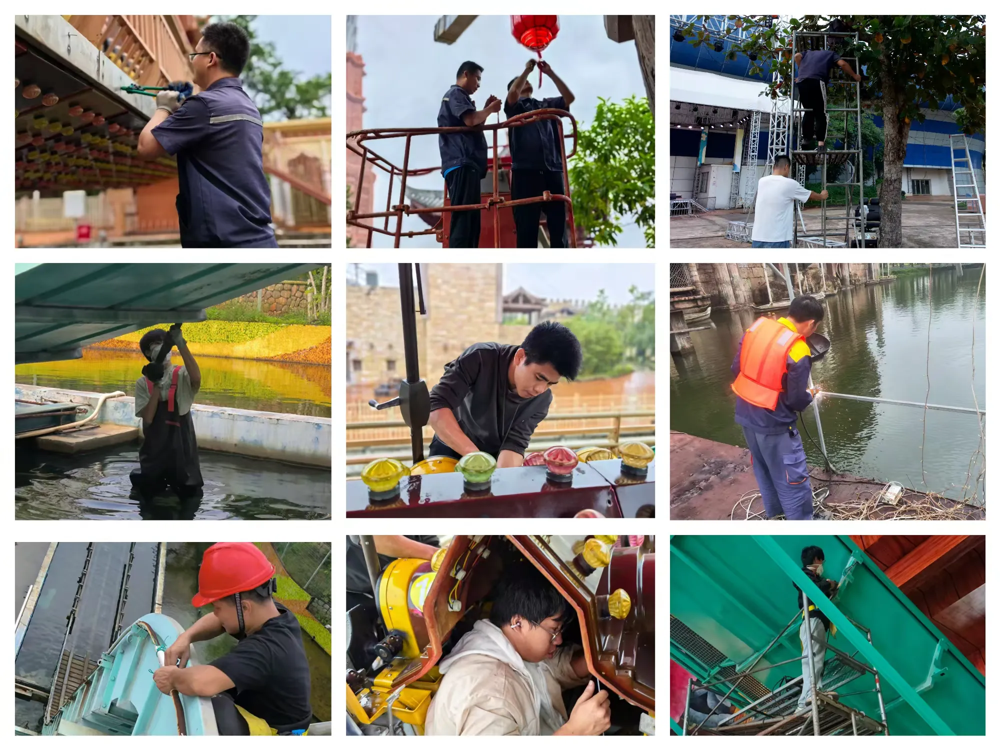 在活动筹备阶段加班加点,一方面反复打磨灯光、激光设备的运行细节,通过多轮试演优化光影呈现效果;另一方面克服高空作业难度,通过简易脚手架便完成园区树木亮化装饰的固定与调试,让夜间园区尽显奇幻质感。活动期间,面对游客激增的情况,设备组将“安全运行”置于首位,对特种设备开展全覆盖、逐台次安全检查,从机械部件到操控系统逐一排查安全隐患,切实守护市民游客游玩安全。