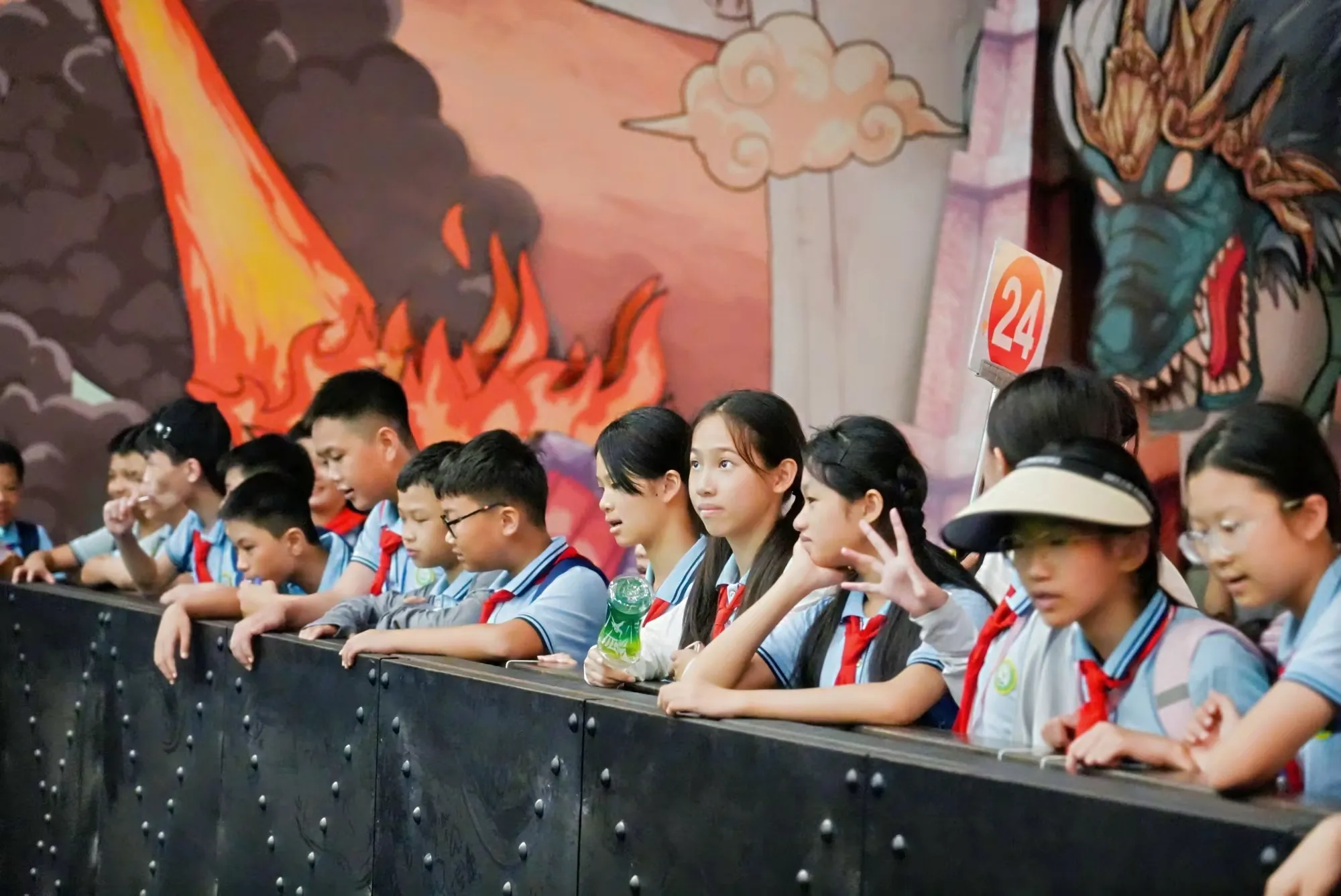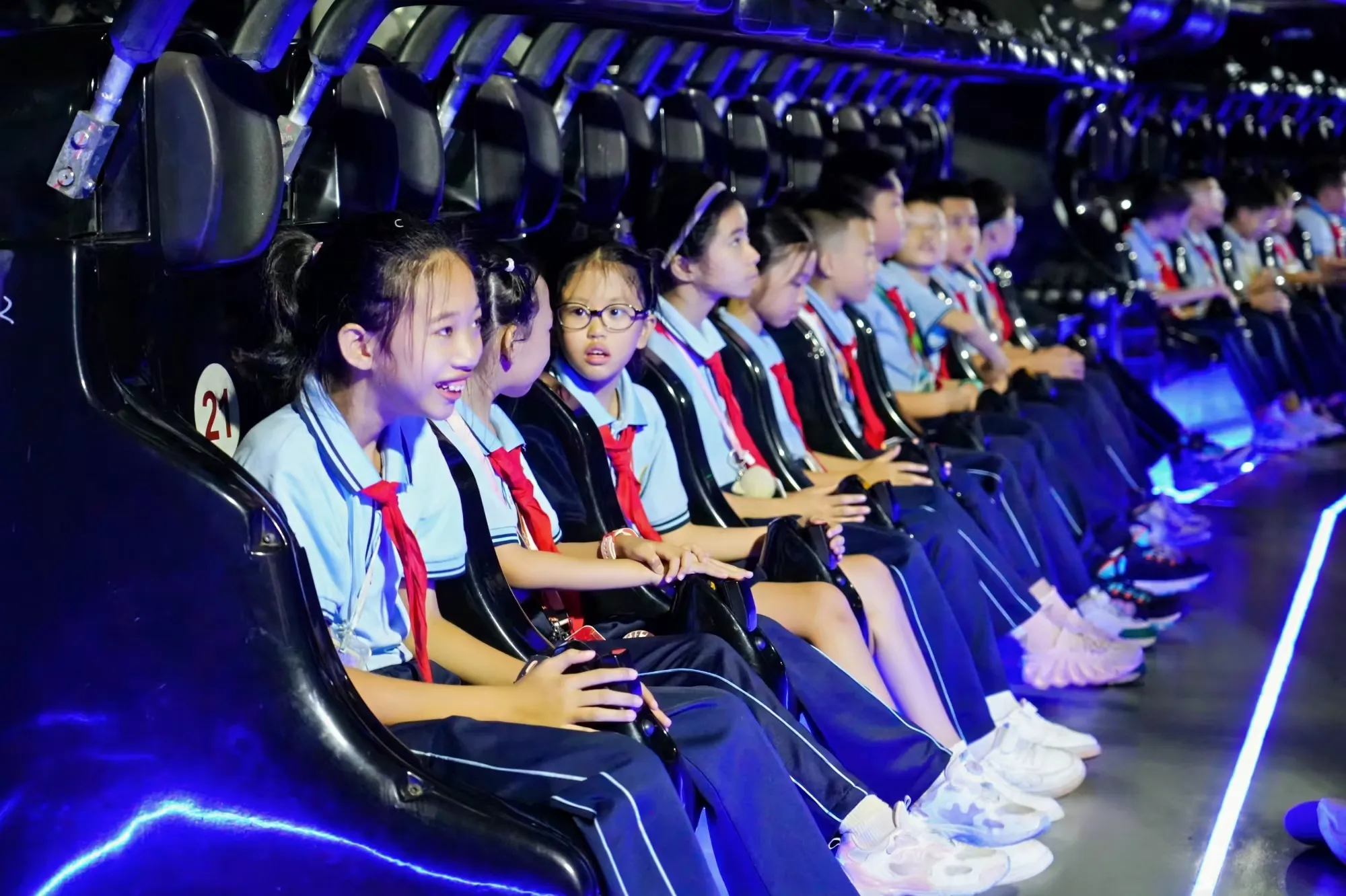 随后体验的游乐项目,更是让研学氛围推向高潮。走进郑和宝船,随着船舱的轻微晃动与环绕音效,学生们仿佛穿越时空,随船队穿越风浪、扬帆远航;坐进4D梦工厂,银幕中扑面而来的动物、座椅窜动的机关、突然飞溅的水雾让学生们下意识伸手遮挡,沉浸式的感官体验让尖叫声与笑声此起彼伏;体验奇幻翱翔,当座椅缓缓升起,脚下从热带雨林到辽阔海岸的景观缓缓铺展,祖国的壮丽山河仿佛触手可及,全场惊叹声接连不断。数字电影技术的魔力,让他们在短短几分钟里,真切感受了“身临其境”的奇妙,也悄悄打开了对科技与艺术融合的好奇之门。从黑白胶片的历史沉淀到数字技术的未来感,这场光影之旅不仅填满了学生的研学手册,更在心中播下了探索文化、向往创新的种子。